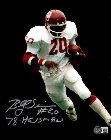 Billy Sims Autographed Signed Oklahoma Sooners 8x10 Photo 20 78 Heisman Beckett Witnessed Hologram Black Background Action